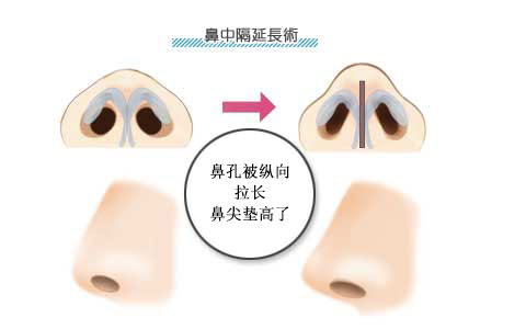 鼻中隔延长术,使得鼻孔的形状向纵向拉长,这样鼻尖就会被垫高。与鼻尖形成术相比鼻尖可以被垫得更高。