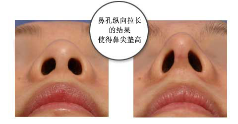 这种情况鼻孔的形状不改变,鼻孔上方的皮肤部分增大,从而使得鼻尖垫高。